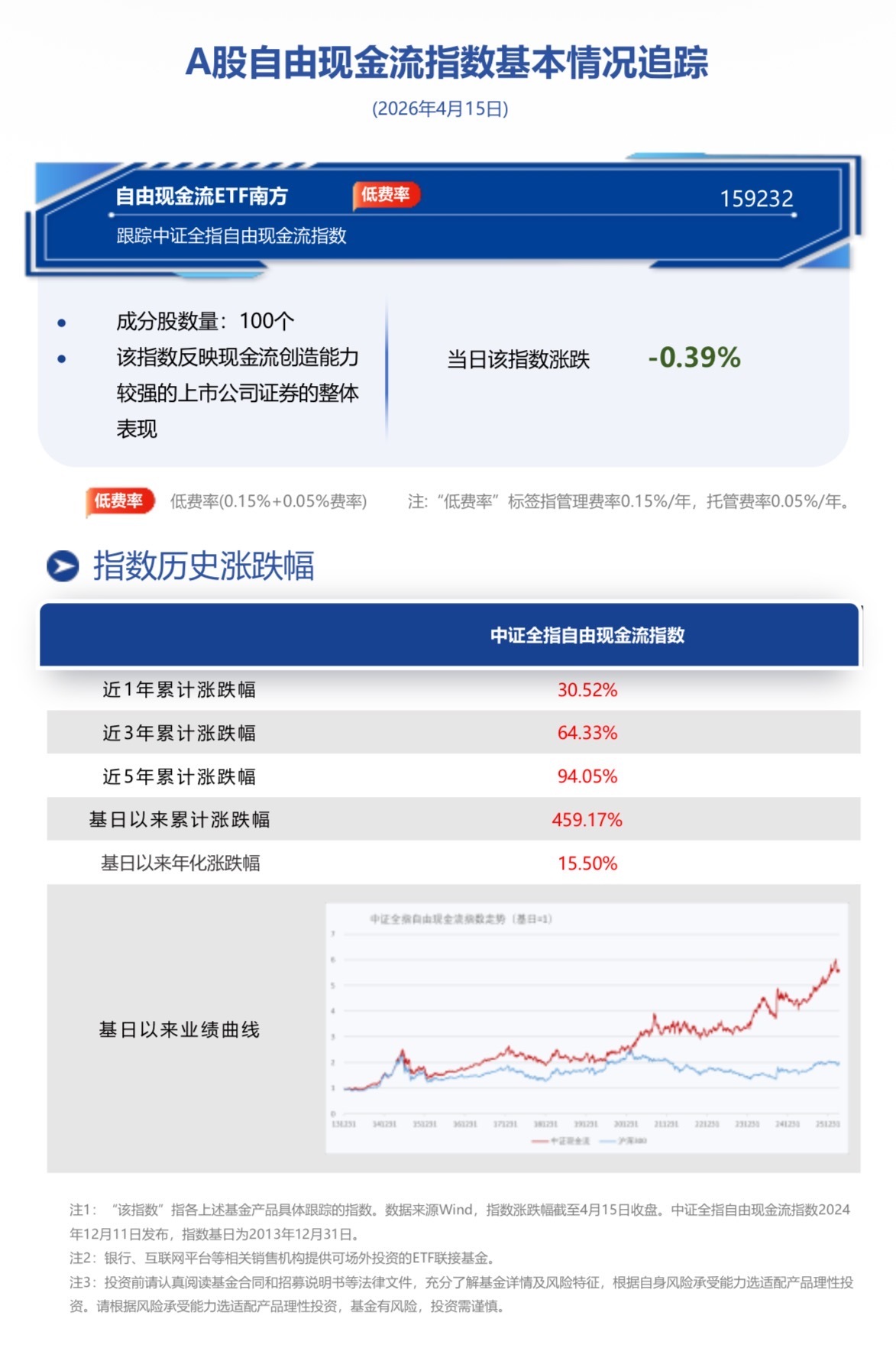 截至2026年4月15日收盤,自由現金流ETF南方(159232)換手6.16%,成交2.66億元,跟蹤標的指數中證全指自由現金流指數(932365.CSI)跌0.39%。