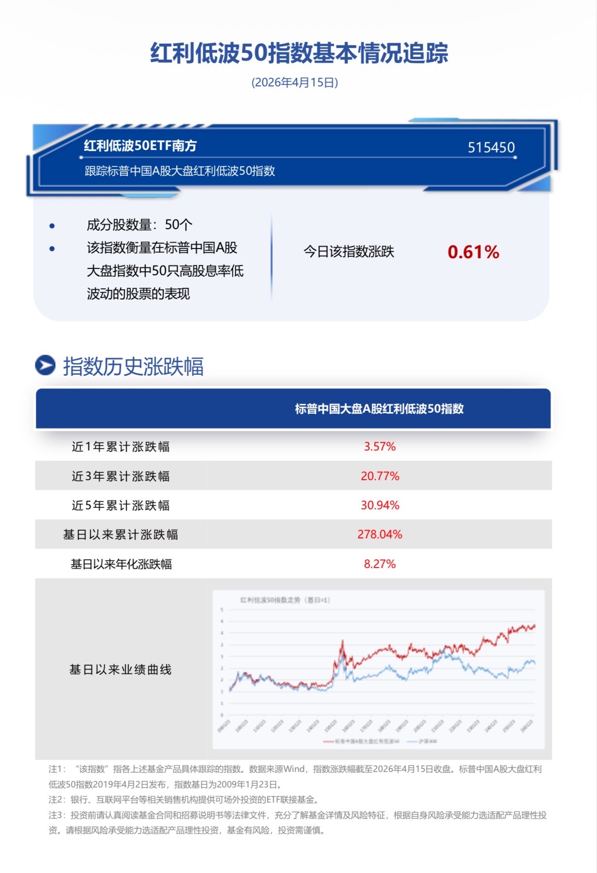 紅利低波50ETF南方(515450.SH)跟蹤標普中國A股大盤紅利低波50指數,指數中在樣本空間、行業分類等方面具備獨特性;截至2026年4月14日,據Wind,紅利低波50股息率按整體法計算為4.5%。