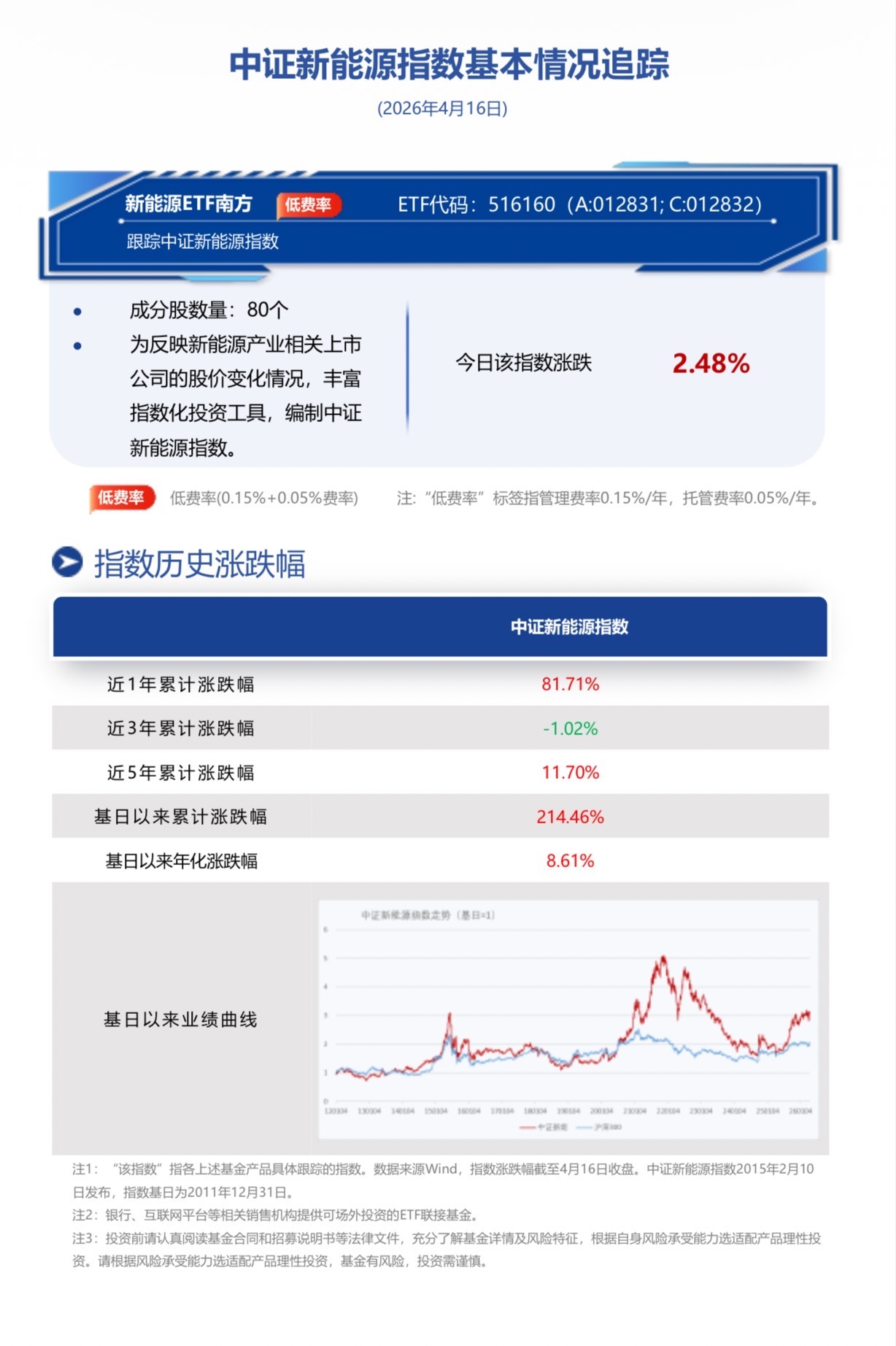 截至2026年4月16日收盤,新能源ETF南方(516160)換手7.15%,成交5.84億元,跟蹤標的指數中證新能源指數(399808)漲2.48%。