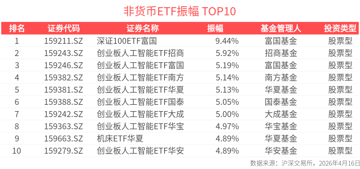 截至今日收盤,深證100ETF富國、創業板人工智能ETF招商、創業板人工智能ETF富國振幅居市場前列,分別達9.44%、5.92%、5.19%。