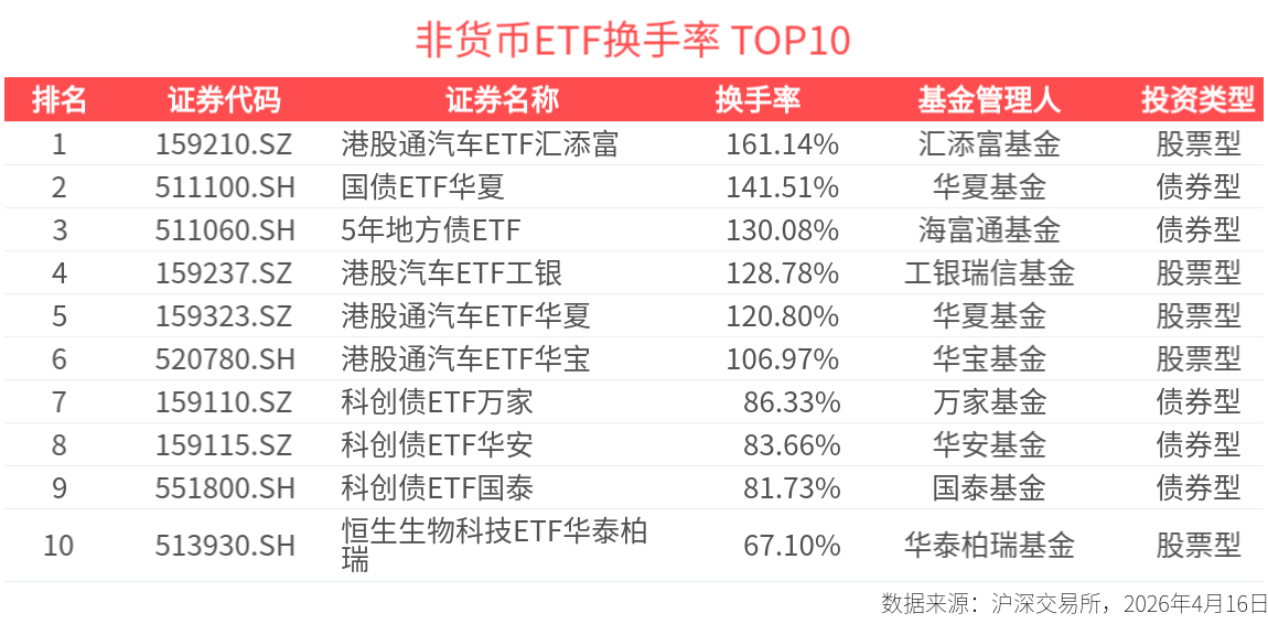 2026年4月16日,非貨幣類ETF合計成交4270.50億元,其中有79只ETF成交額破10億元。