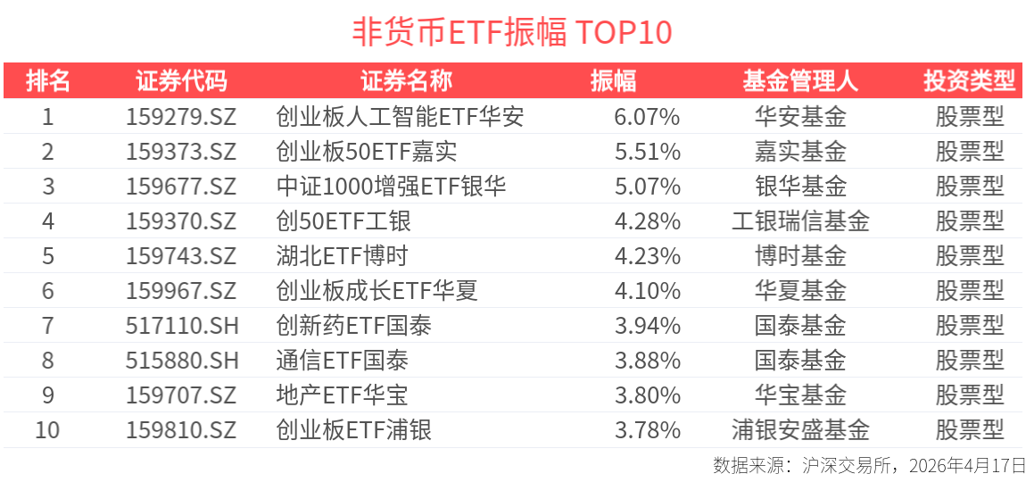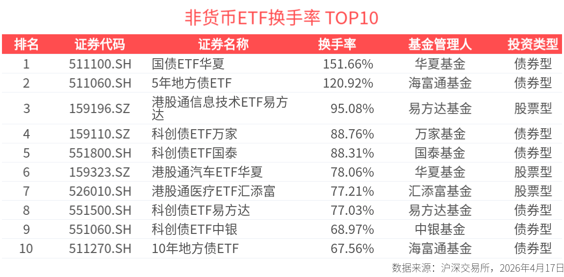 2026年4月17日,非貨幣類ETF合計成交4126.15億元,其中有76只ETF成交額破10億元。