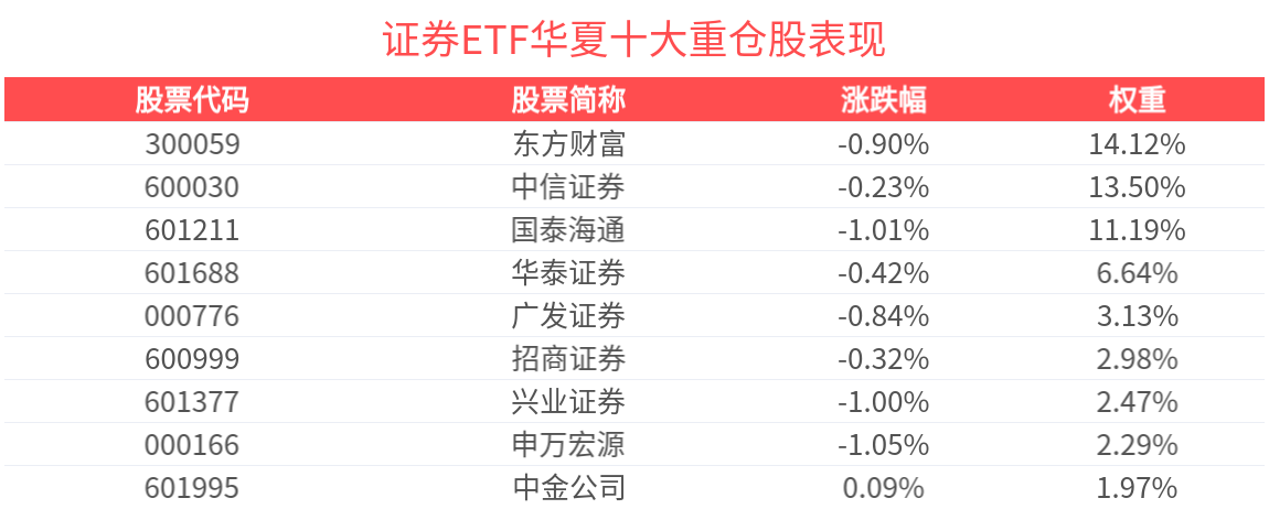 證券ETF華夏(515010)緊密跟蹤中證全指證券公司指數,截至2026年3月31日,指數前十大權重股分別為東方財富、中信證券、國泰海通、華泰證券、招商證券、廣發證券、東方證券、申萬宏源、興業證券、中金公司,前十大權重股合計佔比59.35%。