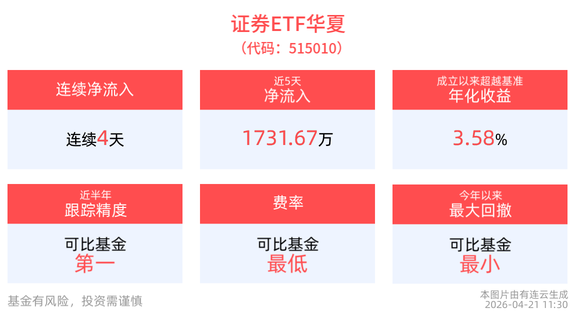 從資金淨流入方面來看,證券ETF華夏近4天獲得連續資金淨流入,合計「吸金」1854.96萬元。截至4月20日,證券ETF華夏最新規模達16.56億元。