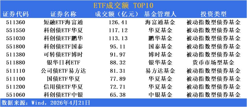 可轉債ETF博時(511380)成交超91億元,銀華日利ETF(511880)成交超88億元,公司債ETF易方達(511110)成交超81億元,國債ETF華夏(511100)成交超77億元,信用債ETF華夏(511200)成交超72億元,利率債、信用債、可轉債及貨幣型品種交投活躍,顯示資金對固定收益類資産的配置熱情高漲。值得注意的是,成交額榜單前十均為債券及貨幣型産品,權益類産品未能躋身前列,反映當前市場避險偏好佔據主導,資金對低波動資産的集中配置需求顯著。
