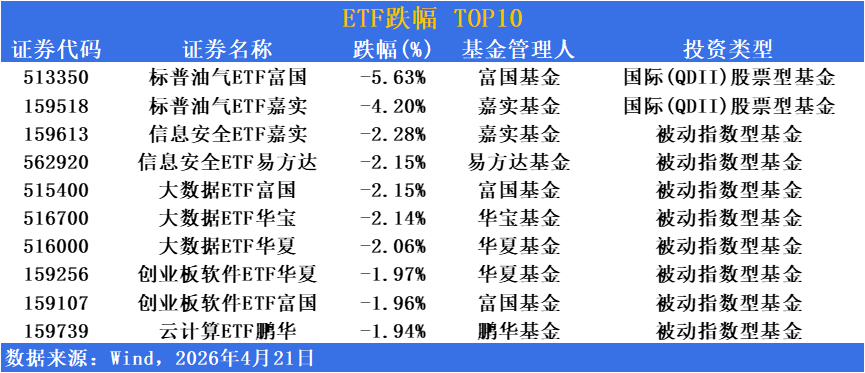 與此同時,信息安全、大數據及雲計算等科技成長板塊在經歷前期快速反彈後迎來技術性調整,相關主題ETF跌幅約2%左右;創業板軟件及雲計算等細分領域同步走弱,相關ETF跌幅接近2%。整體市場呈現能源與科技應用端雙主綫同步回調格局,油氣板塊調整幅度顯著大於科技成長賽道,顯示資金在地緣緩和與估值修復雙重邏輯下,正從能源及軟件應用端向電池、半導體等硬科技景氣賽道輪動切換,市場結構性分化與高低切換特徵明顯。