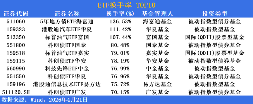 從換手率維度觀察,債券型産品熱度高企,5年地方債ETF海富通(511060)以高達136.53%的換手率遙遙領先,高居當日換手率榜首。標普油氣ETF富國(513350)換手率超107%,標普油氣ETF嘉實(159518)換手率超79%,油氣主題産品交投活躍,反映資金在地緣緩和預期下對跨境能源資産的激烈博弈與短期交易需求。