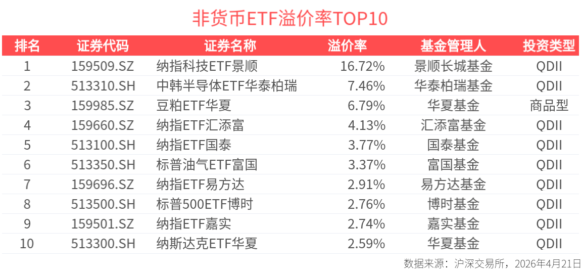 截至今日收盤,納斯達克科技市值加權指數溢價居前,納指科技ETF景順收盤溢價16.72%;中證韓交所中韓半導體指數情緒高漲,中韓半導體ETF華泰柏瑞收盤溢價7.46%。
