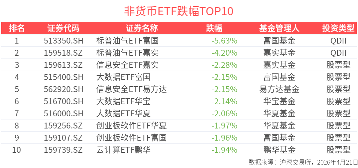 截至今日收盤,全市場共計643只非貨ETF下跌,下跌比例達44%。行業主題指數方面,中證信息安全主題指數、中證大數據産業指數跌幅居前,分別下跌2.38%、2.21%。