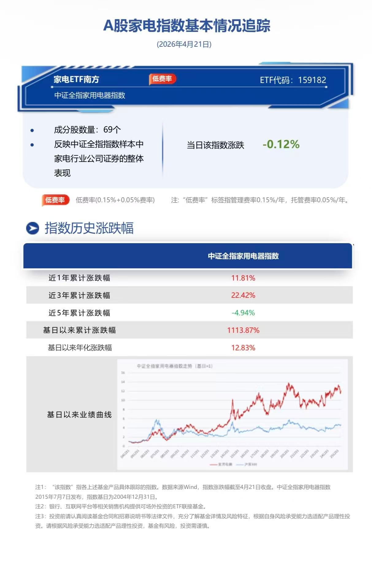 截至2026年4月21日收盤,家電ETF南方跟蹤標的指數中證全指家用電器指數(930697.CSI) 跌0.12%。