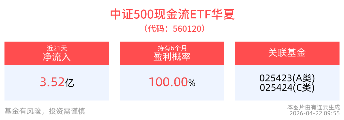 從收益能力看,截至2026年4月21日,中證500現金流ETF華夏自成立以來,最高單月回報為18.04%,最長連漲月數為3個月,最長連漲漲幅為28.85%,漲跌月數比為6/2,上漲月份平均收益率為6.94%,月盈利百分比為75%,月盈利概率為77.07%,歷史持有6個月盈利概率為100%。