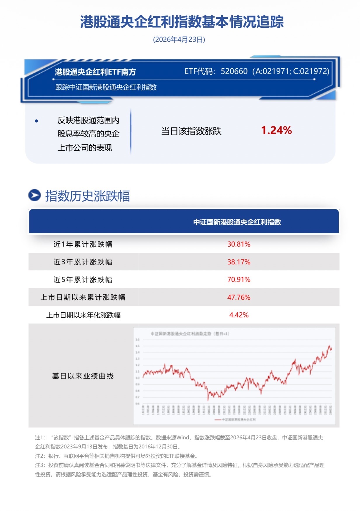 截至2026年4月23日收盤,港股通央企紅利ETF南方(520660)換手3.61%,成交0.96億元,跟蹤標的指數中證國新港股通央企紅利指數(931722.CSI) 漲1.24%。