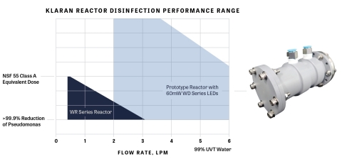 紐約州綠島--(美國商業資訊)--Crystal IS Klaran生產線今日宣布針對其水消毒(WD)系列產品推出新的60mW紫外線發光二極體(UVC LED)。在一個先進的原型反應器中,60mW LED在每分鐘3公升的流速下表現出高效率且經濟實惠的水處理能力,消毒率可達NSF/ANSI 55 A級。Klaran現有的WD系列LED和水處理反應器用於以每分鐘兩公升的流速來處理用水點的水,消毒率相當於NSF/ANSI B級。