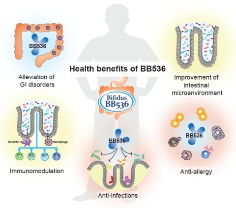 BB536是具有臨床有效性、成熟的多功能益生菌株,擁有人體應用的悠久歷史,用於緩解胃腸道、免疫系統和感染性疾病。半個世紀以來,BB536一直是優越的人體寄生雙歧桿菌(HRB)益生菌株,幫助人們獲得由內到外的最佳健康。攝取BB536能夠提供一貫的有益效應,來改善胃腸道狀況、維持腸道菌叢平衡、調節免疫反應、抗過敏及免於微生物感染。研究證明,BB536與腸道微生物產生協調作用,以推動微調腸道和免疫平衡。