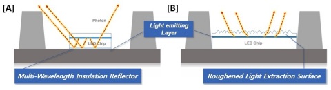 訴訟涉及的專利為通過提高LED光反射率,保障其耐久性和高效率的多波長絕緣反射器(Multi-Wavelength Insulation Reflector)技術【圖A】。該專利技術是用于室内照明、LCD背光等的0.5W~3W級中功率(Mid-Power)LED封裝,且廣泛應用于照明、智能手機、TV背光、汽車等領域。最具代表性的産品有‘2835、3030、5630 LED封裝’。