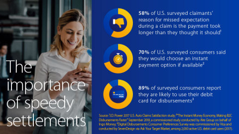 舊金山--(美國商業資訊)--發生撞車或天然災害等緊急情況時,人們絲毫沒有防備,也沒有準備好去填寫保險單、確認索賠估計和支付維修與醫療費用。在此期間的當務之急是快速獲得資金。Visa致力於與保險業的創新公司合作,在個人、家庭和企業最需要資金時,協助將陳舊且耗時的保險理賠給付流程轉變為近乎即時1的資金支付。