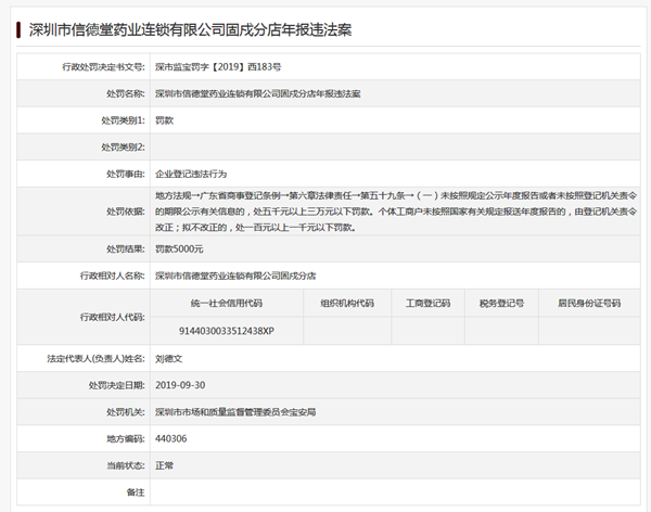 中國網財經10月14日訊 日前,深圳市市場監督管理局發布行政處罰公示公告,公開披露了“深圳市信德堂藥業連鎖有限公司固戍分店年報違法案”。該公司因涉及企業登記違法行為,被深圳市市場和質量監督管理委員會寶安局罰款5000元。