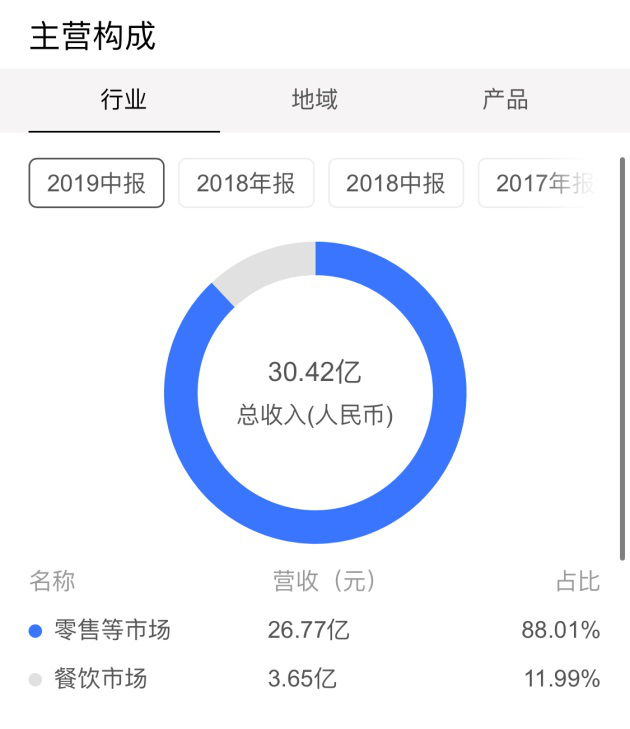 據悉,2019年上半年,三全食品來自零售等市場和餐飲市場的收入,分別約為26.77億和3.65億元,占比各在88%和12%左右。