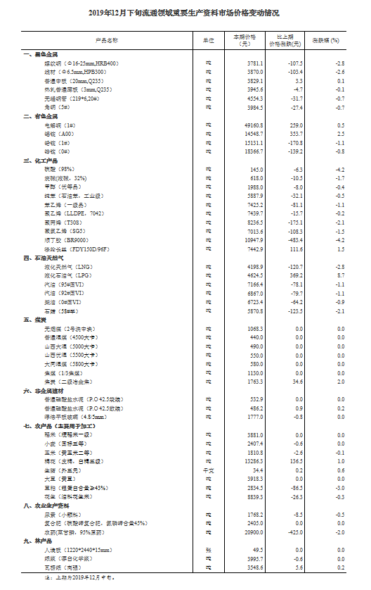 中國網財經1月6日訊 據國家統計局網站消息,統計局發布2019年12月下旬流通領域重要生産資料市場價格變動情況。據對24個省(區、市)流通領域9大類50種重要生産資料市場價格的監測顯示,2019年12月下旬與12月中旬相比,10種産品價格上漲,26種下降,14種持平。其中,生豬(外三元)本期價格每千克34.4元,環比上漲0.6%。