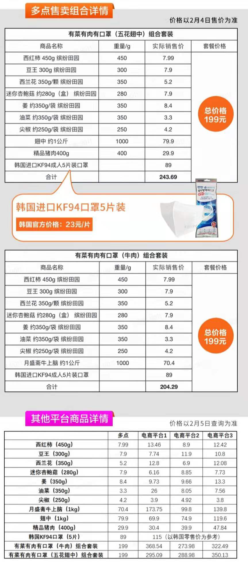 公開信息顯示,2月4日,物美多點App上線了兩款“硬核套餐”。這一“有菜有肉有口罩”套餐除了5片韓國進口的KF94口罩外,還有7種蔬菜,以及牛肉或五花雞翅分為2種不同肉類,售價均為199元。