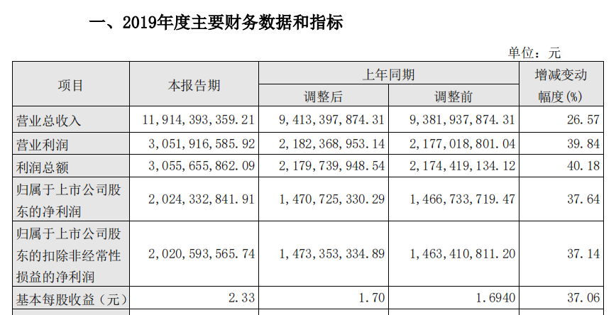 中國網財經2月6日訊 今日晚間,山西汾酒(SH:600809 )發布2019年業績報告,營業收入119.14億元,較上年同期增長26.57%,歸屬于上市公司股東的淨利潤20.24億元,較上年同期增長37.64%,每股收益2.33元,較上年同期增長37.06%。
