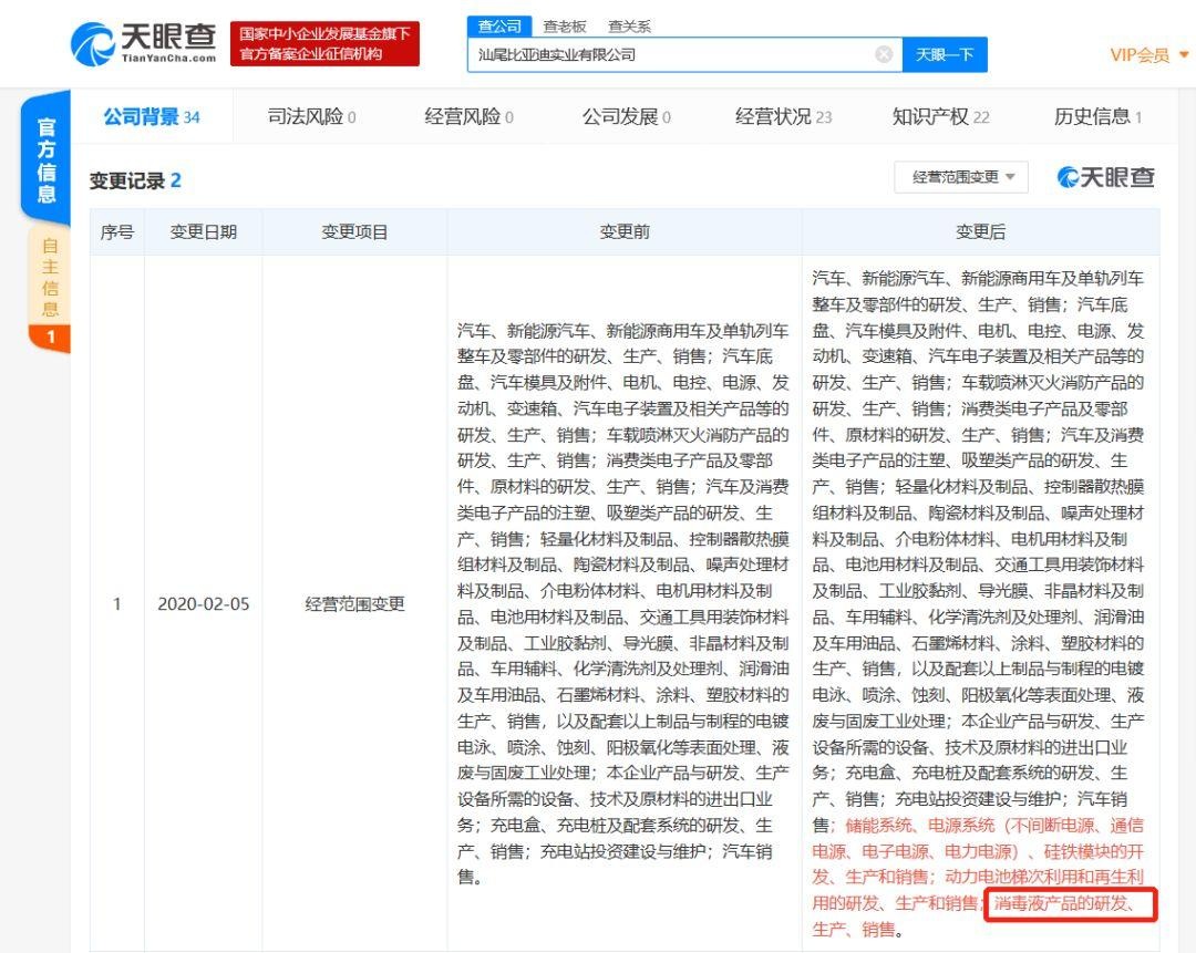 在全國抗擊疫情的關鍵時刻,上汽通用五菱旗下的柳州寶駿工廠已改建生産線轉産口罩,日産量可達170萬只;比亞迪全資子公司汕尾比亞迪實業公司的經營範圍則在2月5日新增了消毒液這項生産項目。