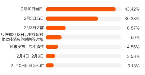 中國網科技2月7日訊(記者 胡愛善) 受疫情影響,衆多企業紛紛推遲複工時間。獵聘網給出報告顯示,73.8%企業選擇在2月10日或2月3日兩日複工,其中,更多企業(43.42%)選擇在2月10日當日複工。