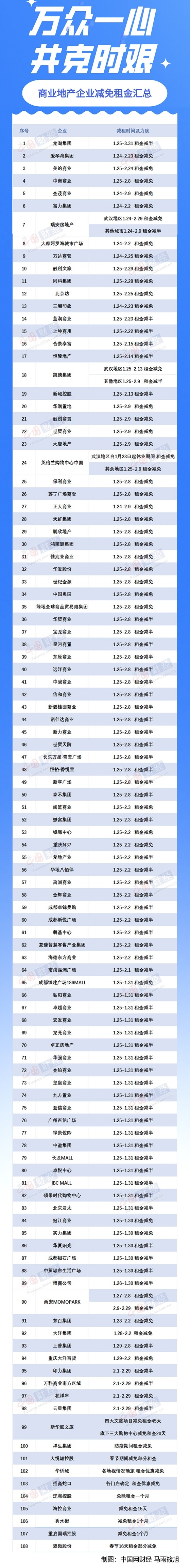 萬達商管也于1月28日宣布,將對全國各地所有萬達廣場的商戶自1月24日-2月25日時間内的租金及物業費實行全免政策,預計減免租金額度達到30-40億元。