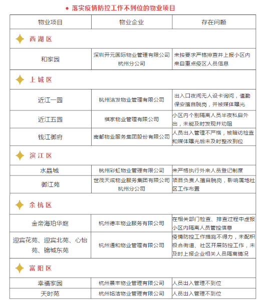 同時因落實疫情工作不到位被通報的物業項目還有上城區的近江一園、近江五園,涉及的物業企業分別是杭州潔發物業管理有限公司、祺家物業管理有限公司等。