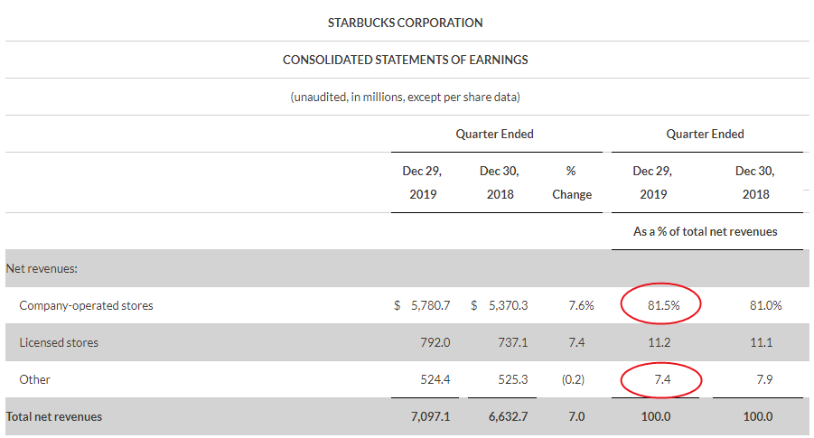 此外,財報數據還顯示,星巴克自營收入的比例在不斷提升,本季度直營店收入占總收入比例高達81.5%,而其他收入占比在本季度下降到7.4%。