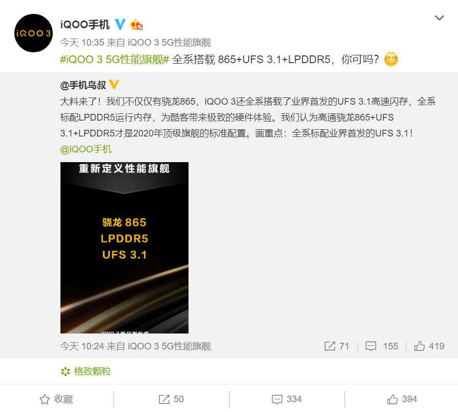 中國網科技2月13日訊 今日上午,iQOO官方正式公布了iQOO 3 5G詳細配置信息。除了搭載骁龍865+LPDDR5内存外,還將配備最新的UFS 3.1存儲。