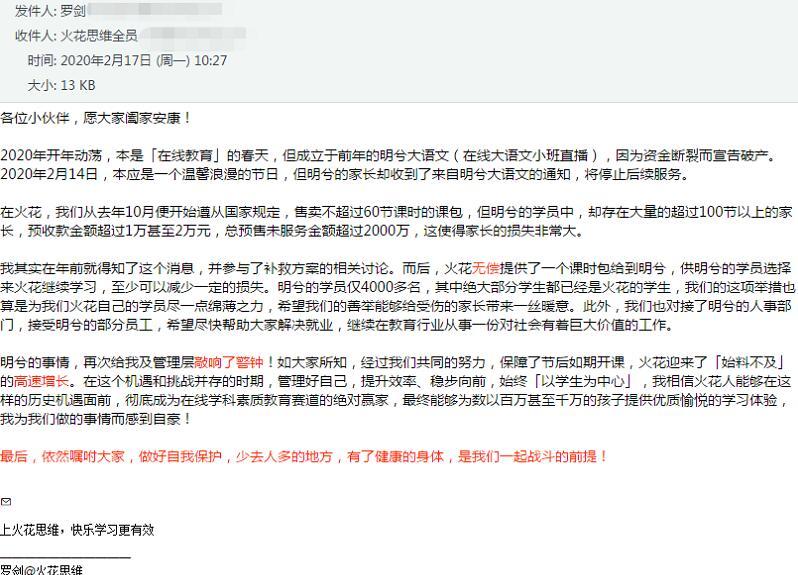 火花思维创始人罗剑在给全公司发布的内部信中表示,火花从去年10月份开始遵从国家规定,售卖不超过60节课时的课包,但明兮的学员中却存在大量的超过100节以上的家长,预收款金额超过1万甚至2万,总预售未服务金额超过2000万元,这使得家长损失非常大。经过讨论,火花无偿提供课时包给到明兮,供明兮学员来到火花继续学习。