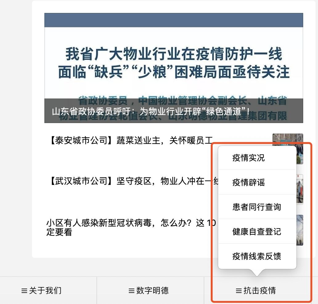明德集團在“明德物業管理集團”微信公眾號内新增了功能欄目【抗擊疫情】,功能欄目中主要包含“健康自查登記”、“疫情線索反饋”、“疫情實況”、“疫情辟謠”、“患者同行查詢”5大功能。