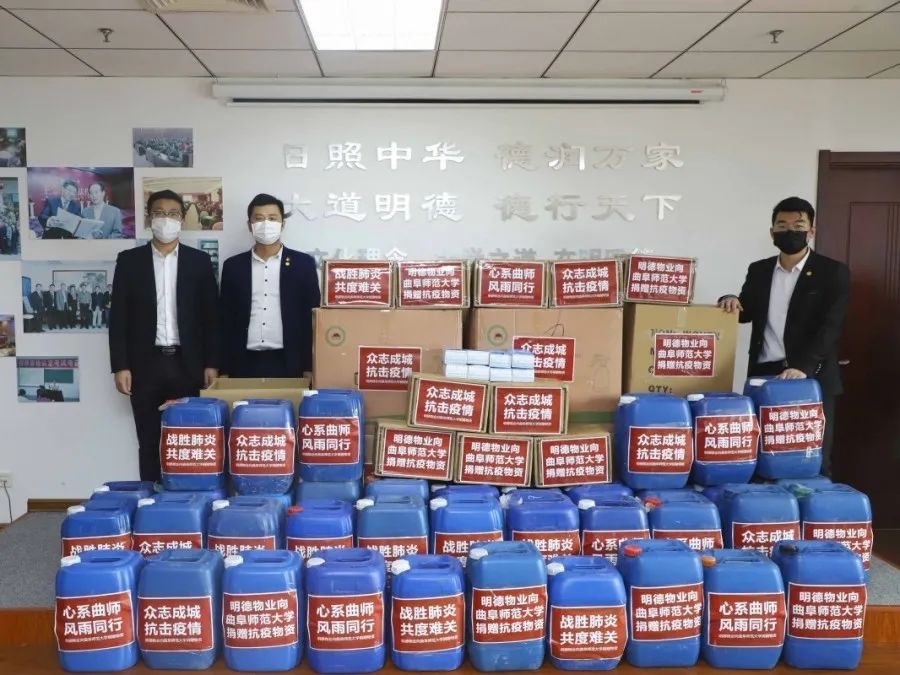 隨後,明德集團先後向曲阜師範大學、湖北省高等學校後勤管理研究會、新疆生產建設兵團第十二師、安徽高校後勤協會物專會等捐贈防疫物資,送去防疫緊缺的口罩、手套、噴壺、藥品、消毒液等。