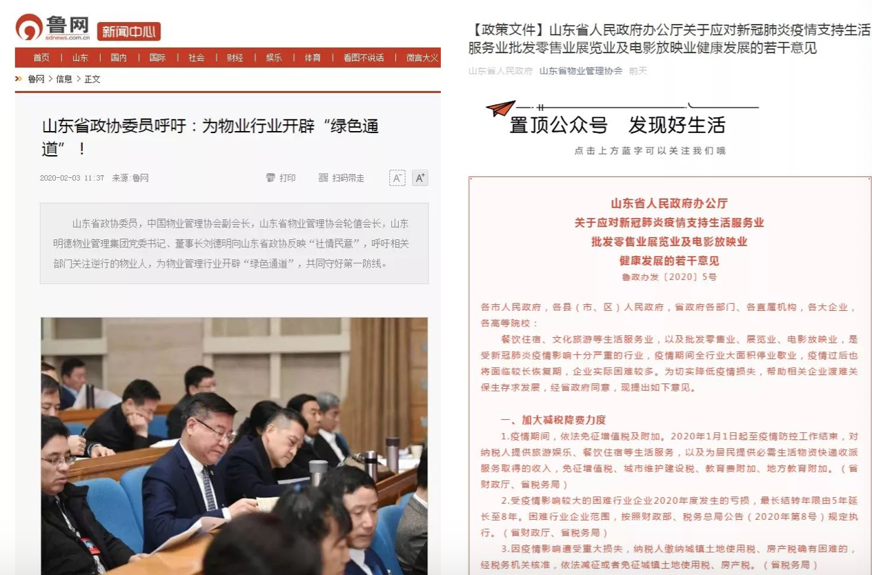 此後 ,劉德明通過各種渠道為行業呼籲,也受到眾多媒體關註。值得欣喜的是,在物業人的共同努力下,物業人“被看見”,越來越多的地方出台支持性政策。山東省政府發佈《關於應對新冠肺炎疫情支持生活服務業批發零售業展覽業及電影放映業健康發展的若幹意見》,明確山東省各市可對物業服務企業給予適當補貼。