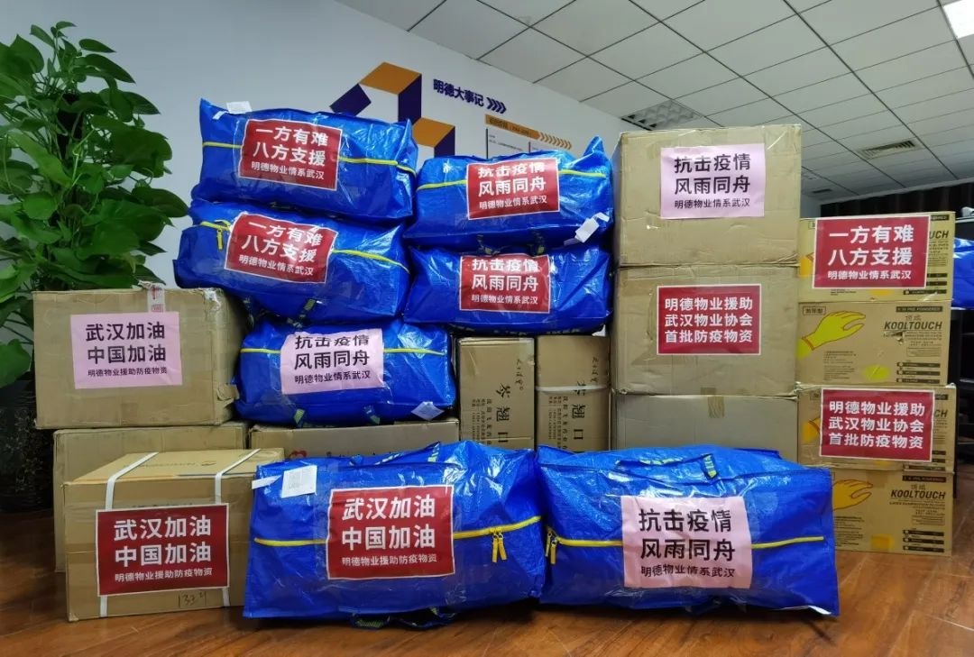 1月26日,大年初二,武漢市物業管理協會發出物資呼籲。明德集團迅速行動,籌資物資,1月29日,大年初五,首批防疫物資(口罩10000只、乳膠手套4000只、藥品400盒、噴壺500個)全部發往武漢,2月1日,武漢物業管理協會在武漢市紅十字會國博中心倉庫接收全部物資,這是彼時武漢市物協收到的第一批省外企業的捐贈物資。