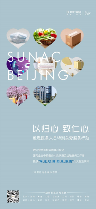 自2月24日起,融創北京區域集團“致敬醫護人員·特别關愛服務行動”即將正式開展,各大城市暖心聯動,為融創業主中的醫護工作者家庭及當地醫護工作者,提供“採、送、收、陪、掃、禮、遊、購”八大生活關懷。我們將動員歸心社區大家庭的力量,從日常的方方面面予以關照,讓醫護家屬們安心生活,讓醫護英雄們放心“戰鬥”。