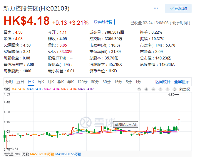 新力控股集團(HK:02103)收盤價報4.18港元每股,漲3.21%。
