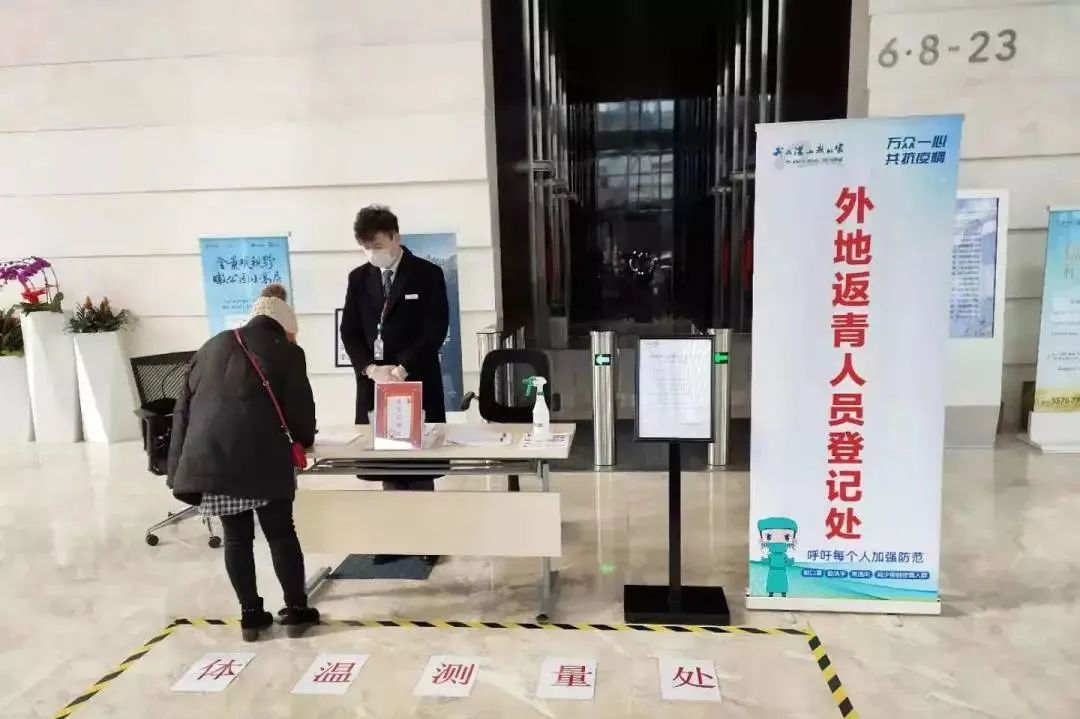 辰時,一日之計在於晨,隨著寫字樓返崗復工人員增多,各寫字樓積極部署,測溫、檢查戴口罩、進樓登記,全方位保障人員健康安全,併在大堂或者進出口都提供了免洗洗手液,或者酒精消毒。門前的地墊每定期用84消毒液進行消毒,以降低外部的病毒病菌進入樓宇。為寫字樓業戶築起“防護牆”,精準護航企業復工復產。