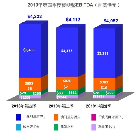 于2019年第四季度,集團淨收益為130億港元,按年下跌8%,按季上升2%,經調整EBITDA為41億港元,按年下跌6%,按季下跌1%。「澳門銀河™」經調整EBITDA為32億港元,按年下跌6%,按季上升1%。澳門星際酒店經調整EBITDA為7.82億港元,按年下跌12%,按季下跌6%。「澳門百老匯™」經調整EBITDA為1,600萬港元,對比2019年第三季度為200萬港元及2018年第四季度為800萬港元。