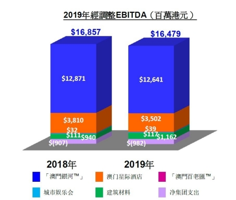 在 2019年,由于銀娛博彩業務淨贏率偏高,令經調整 EBITDA 增加約8.24億港元。淨贏率正常化後,2019年經調整EBITDA為157億港元,按年下跌10%。