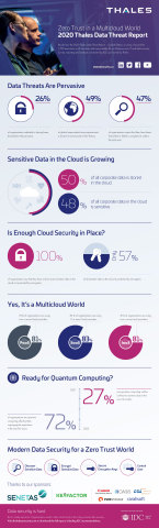 巴黎拉德芳斯區--(美國商業資訊)--根據《2020年泰雷茲數據威脅報告-全球版》(2020 Thales Data Threat Report – Global Edition)以及IDC在其中的研究和分析表明,組織已達到全球雲臨界點,導致其難以應對數字化轉型(DX)帶來的安全挑戰。如今,全部受訪公司數據中有一半(50%)存儲在雲端,其中有將近一半(48%)被認為是敏感數據。隨著多雲使用成為公司的新常態,所有受訪者均表示,有部分存儲在雲中的敏感數據未經加密,而全球有49%的受訪者表示遭遇過數據泄漏。除了數字化轉型和多雲的複雜性之外,這項全球研究還表明,量子計算已經一躍成為備受關注的重大問題,有72%的組織聲稱量子計算將在未來五年内影響其安全和加密操作。
