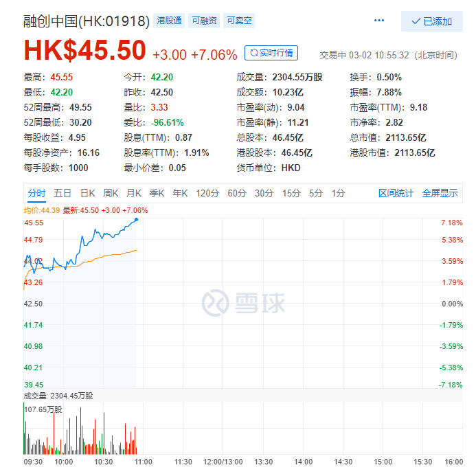 樂居財經訊 王帥 3月2日,三大股指高開,滬指漲0.66%,深成指漲1.23%,創業板漲1.88%。截至發稿,融創中國(01918.HK)大漲超7%,報價45.5港元每股,成交額10.23億港元。