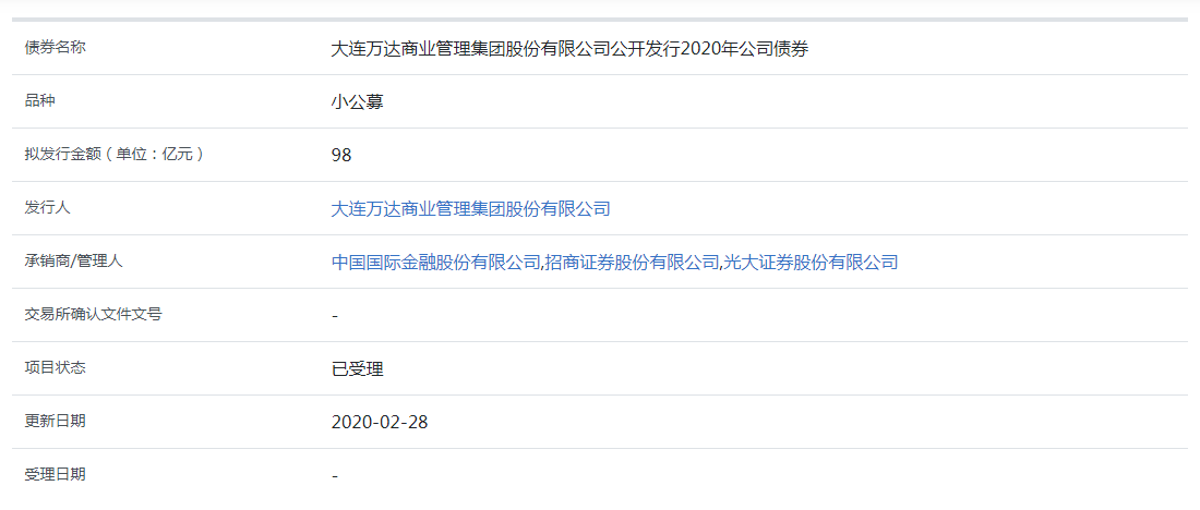 樂居財經訊 王鴻 近日,據上交所披露,大連萬達商業管理集團股份有限公司公開發行2020年公司債券項目狀態更新為“已受理”。