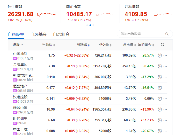 地產股方面,恒盛地產漲超7%,綠城中國漲超6%,朗詩地產、融創中國、旭輝控股集團漲超5%,碧桂園漲超3%。