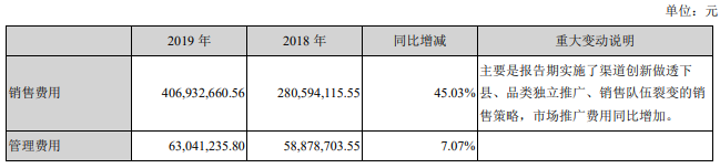 公司在年報中表示,2019年銷售費用之所以有較大變化,是因為報告期實施了渠道創新做透下縣、品類獨立推廣、銷售隊伍裂變的銷售策略,市場推廣費用同比增加。