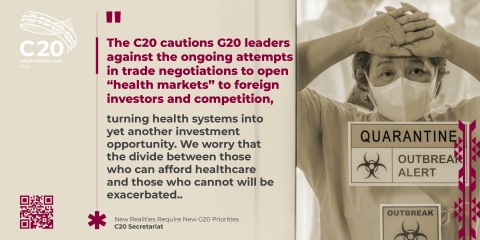 這次緊急情況的另一個新教訓是,供應鏈的超全球化使得我們的貿易體系極易受到衝擊的影響。C20提醒G20領袖注意不要試圖在貿易協定談判中向外國投資者和競爭開放「醫療市場」,將醫療系統變成另一個投資機會。我們擔心,那些能夠負擔醫療保健的群體和那些無力負擔的群體之間的鴻溝將會加劇。