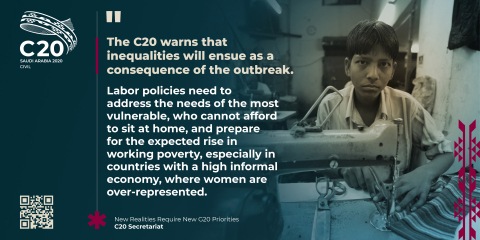 C20提醒,由於疫情爆發,不平等現象將隨之發生。勞動政策應當滿足最弱勢群體的需求(這些人無法負擔不開工的成本),並為工作貧窮群體的預期上升做好準備,特別是在非正式經濟偏高、婦女人數過多的國家。