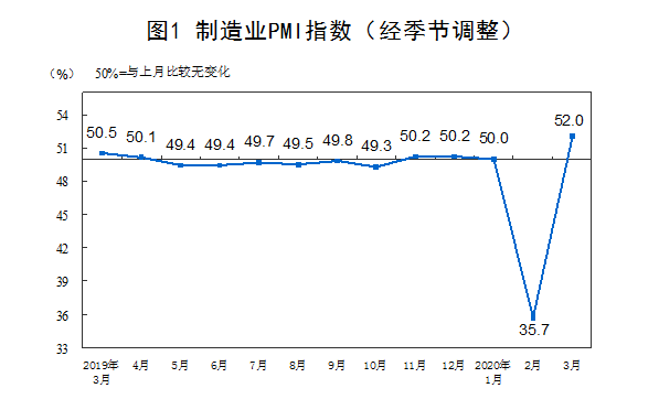 3月份,中國制造業采購經理指數(PMI)為52.0%,比上月回升16.3個百分點。