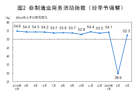 3月份,非制造業商務活動指數為52.3%,比上月回升22.7個百分點。